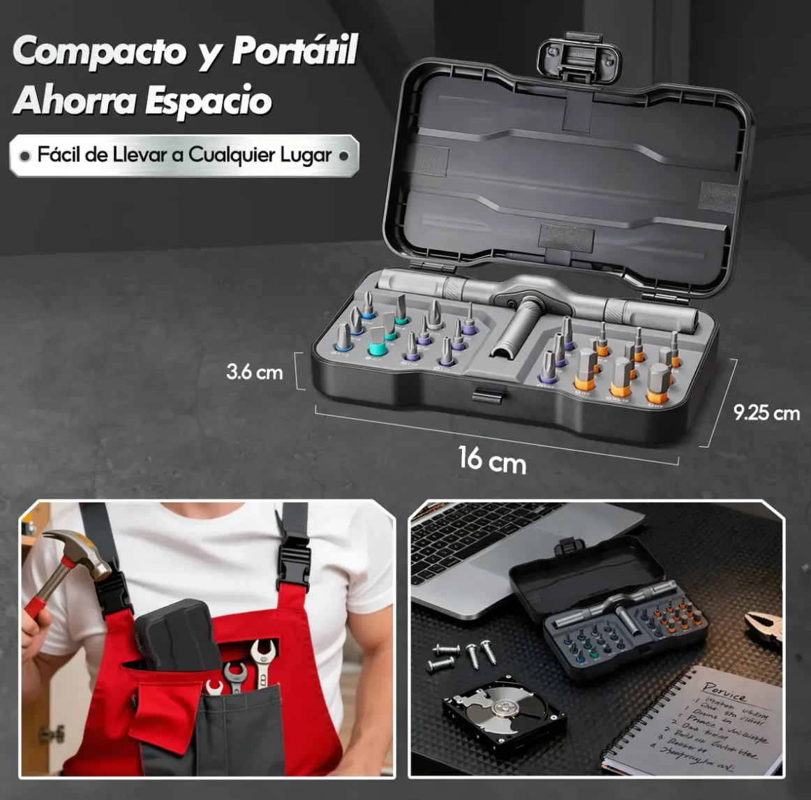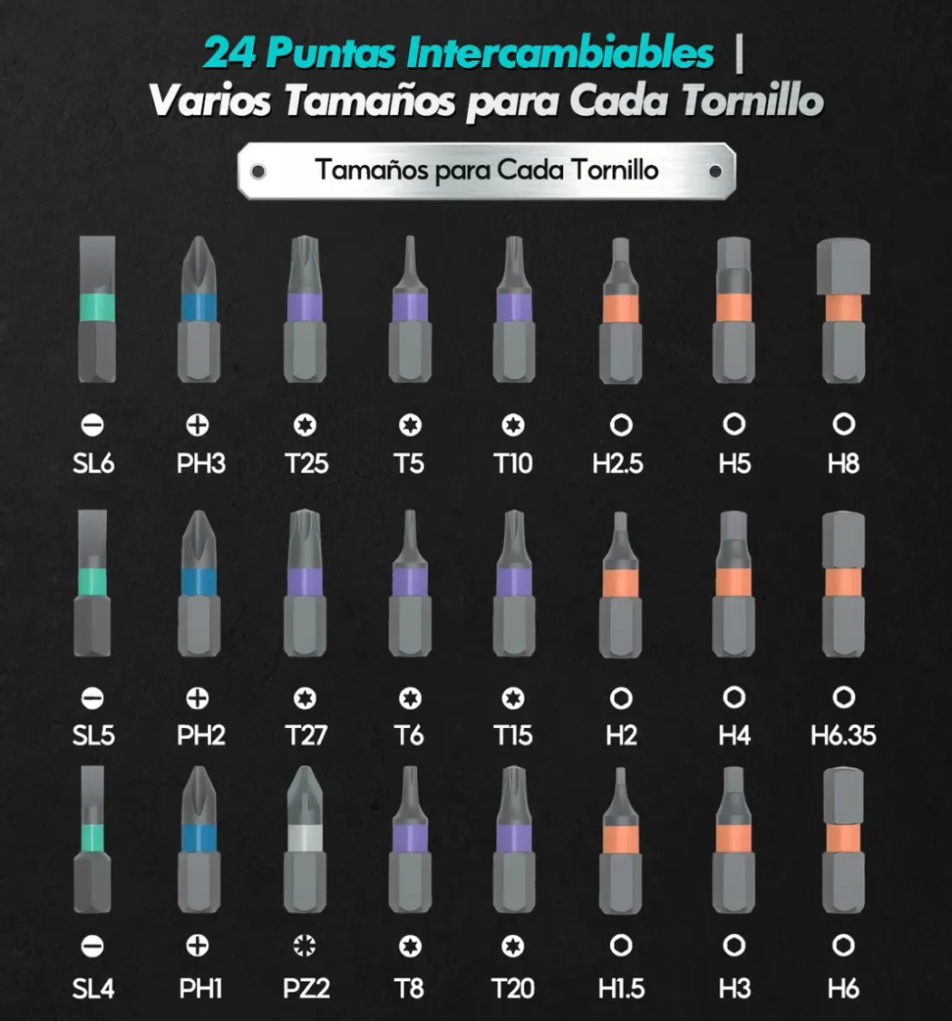 Este juego de destornilladores cuenta con múltiples tipos de brocas, como Phillips/de cruz, plana/ranurada, Pozidriv, Torx/estrellas y hexagonal, lo que lo hace perfecto para todas sus tareas, ya sea que esté reparando electrodomésticos, ensamblando muebles o realizando mantenimiento automotriz.