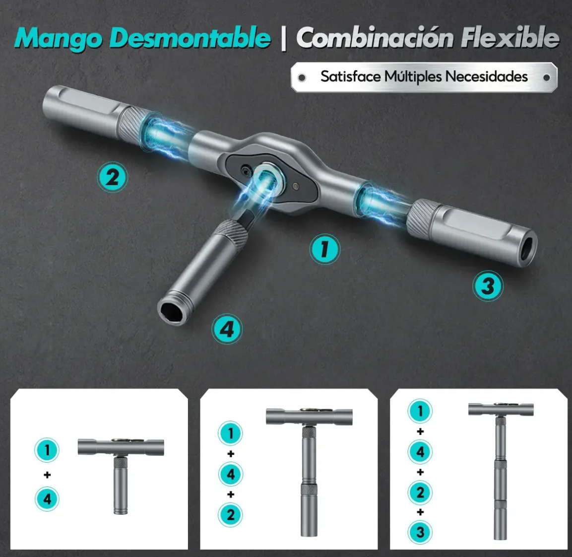 El mango presenta una estructura desmontable que permite múltiples combinaciones y ajustes versátiles para adaptarse a diferentes situaciones, como su uso en espacios estrechos.