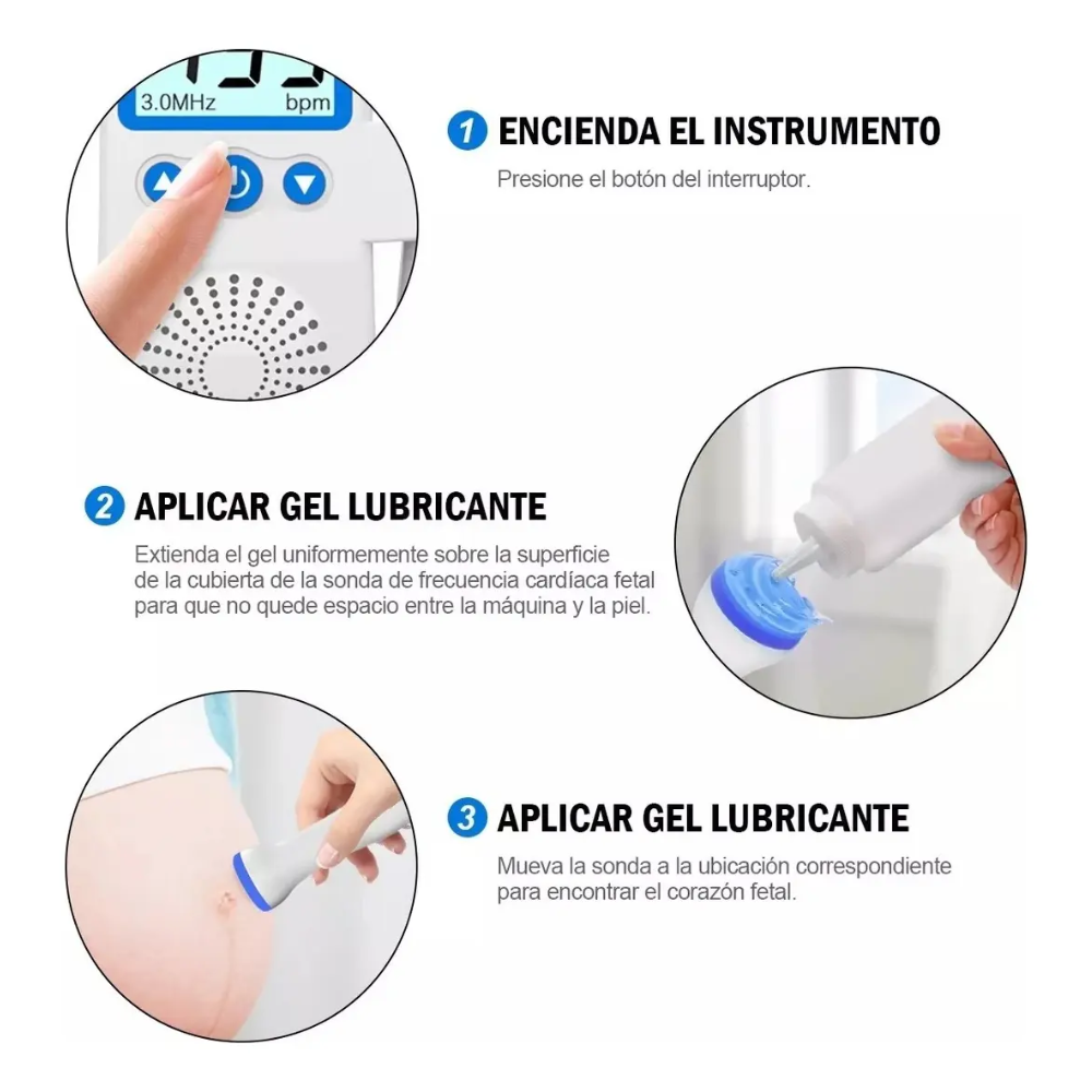 Este detector cuenta con una sonda de 3.0 MHz que permite captar los sonidos cardíacos fetales con alta sensibilidad, mostrando también la frecuencia cardíaca en pantalla LCD. Su uso es sencillo, rápido y práctico, incluso sin experiencia previa.